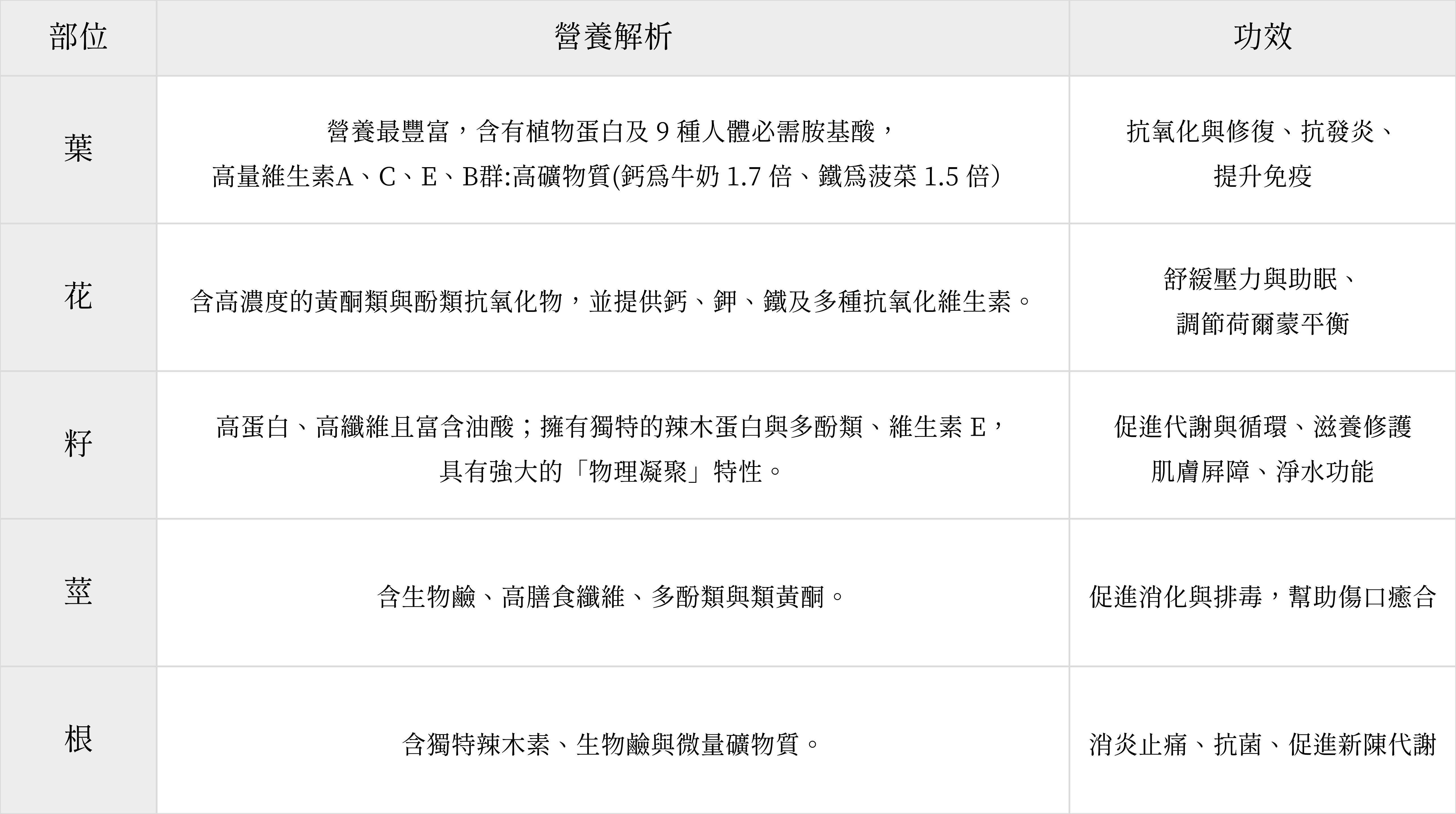 ※ 註:依台灣法規,目前僅辣木「葉」與「種子」開放微食品原料,其餘部位尚未核准。